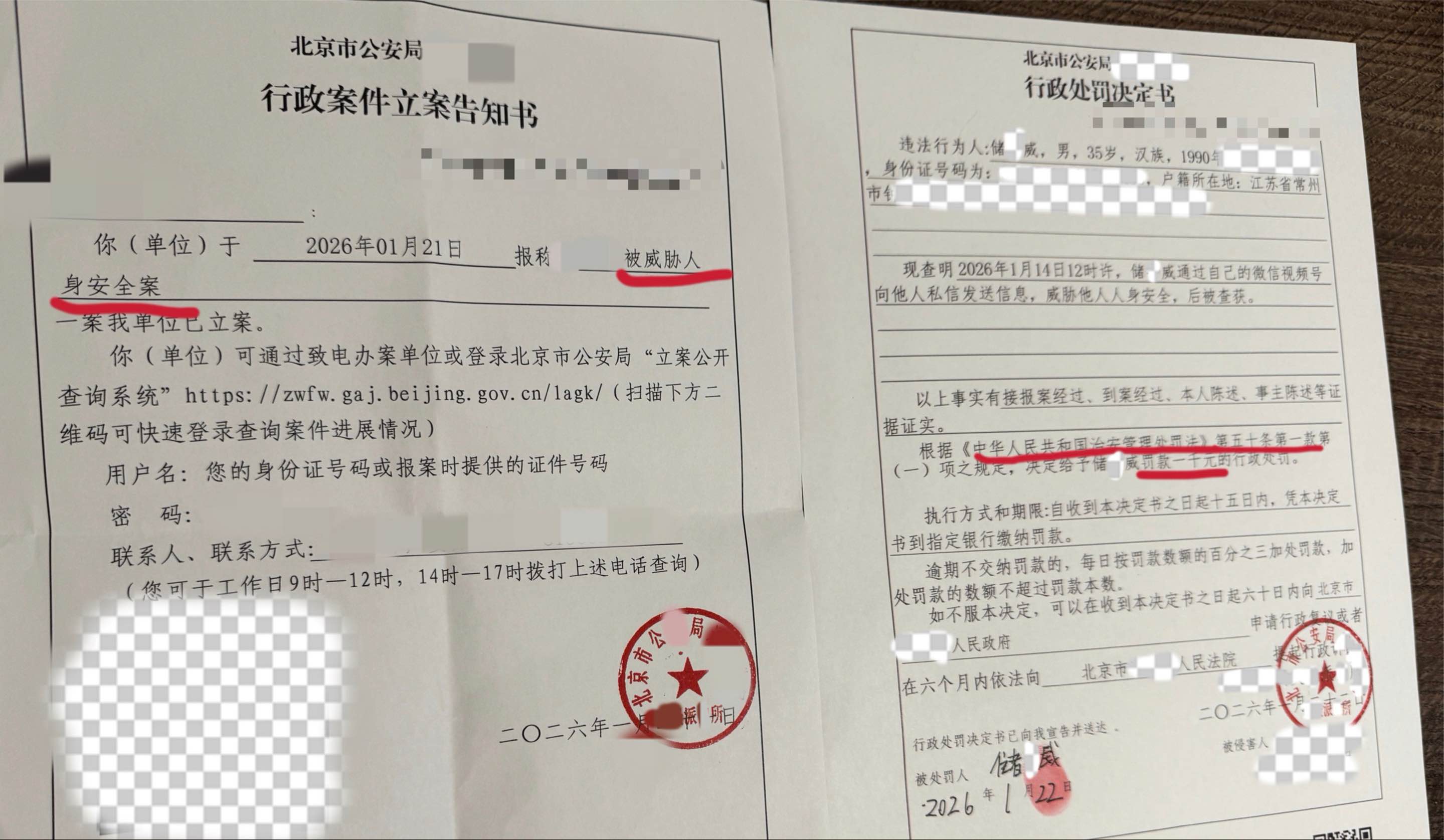 另一份《行政处罚决定书》披露,行恶当作东说念主储某某,男,35岁。现查明2026年1月14日12时许,储某某通过我方的微信视频号向他东说念主私信发送信息,贬抑他东说念主东说念主身安全,后被查获。警方阐明《顺次科罚处罚法》第五十条第一款第(一)项之礼貌,决定予以其罚金1000元的行政处罚。该决定书的题名期间为1月22日。
